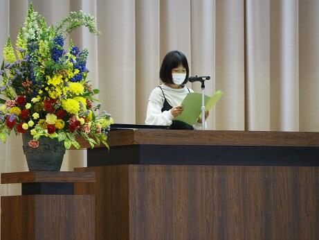 5人の児童代表(5年:吉田瑠育くん、4年:中口優くん、3年:髙須佳乃さん、2年:波越幸之介くん、1年:波越芽咲さん)が壇上で修了書を受け取りました。そのあとには、2人の代表児童が1年間を振り返っての作文を発表しました。