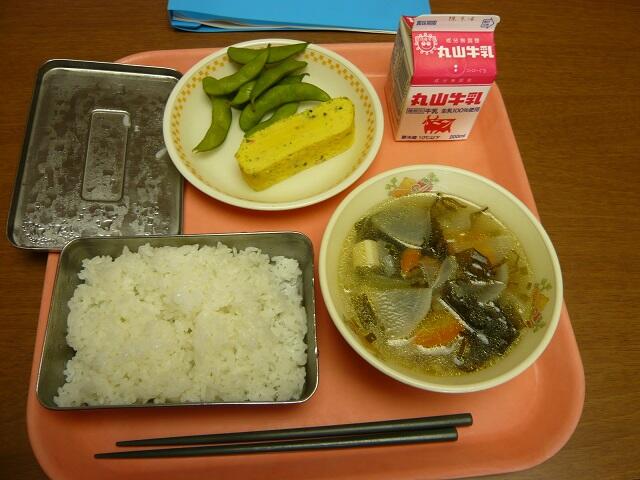 8月30日 給食~彩り野菜の卵焼き もずくスープ 枝豆 ご飯 牛乳