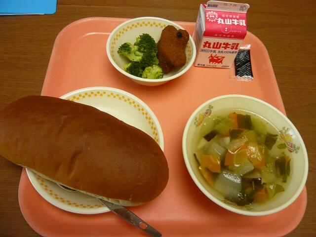7月18日 給食 お星様コロッケ ブロッコリー 冬瓜のスープ パン 牛乳