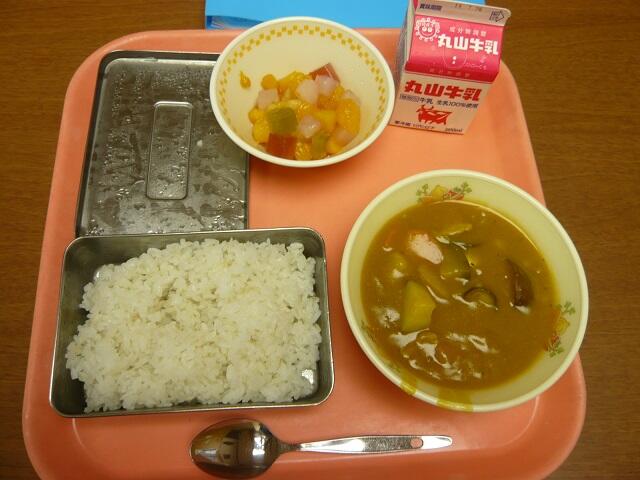 7月19日 給食 夏野菜カレー フルーツナタデココ ご飯 牛乳