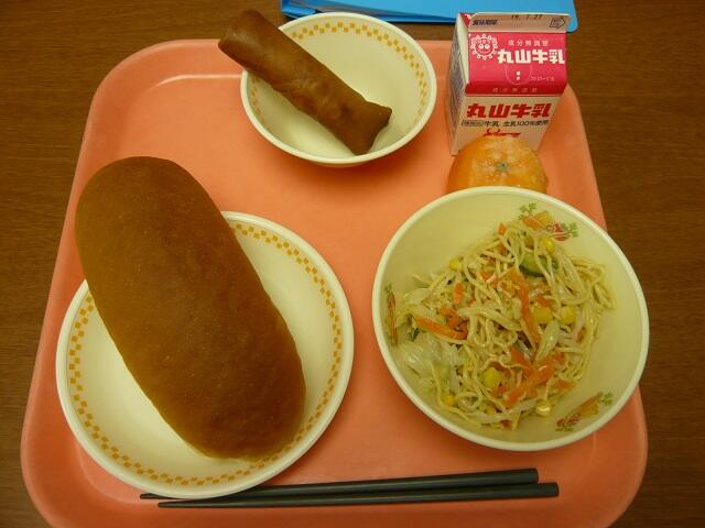 7月22日 給食 冷やし中華 揚げ春巻き 冷凍ミカン コッペパン 牛乳