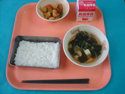 ↑ ごはん、牛乳、鶏肉とサツマイモの揚げ煮、わかめスープ