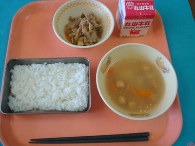 ↑ 今日の給食は、ごはん、牛乳、ツナ丼、豆乳豚汁でした。