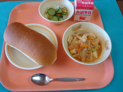 ↑ 今日の給食は、ミルクパン、牛乳、豆腐のチリソース煮、ピーマンドレッシングサラダでした。