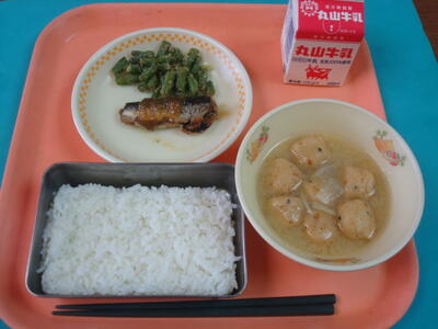 ↑ 今日の給食は、ごはん、牛乳、いわしのみぞれに、インゲンのごま和え、がんもどきの味噌汁でした。