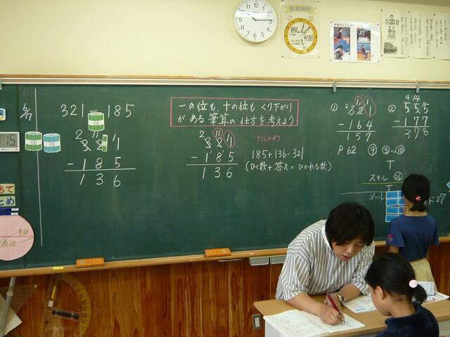 3年生の教室には、県内のたくさんの先生方が、淵上先生の授業を見に来られました。3年生は緊張しながらも、普段通り算数の授業に集中していました。