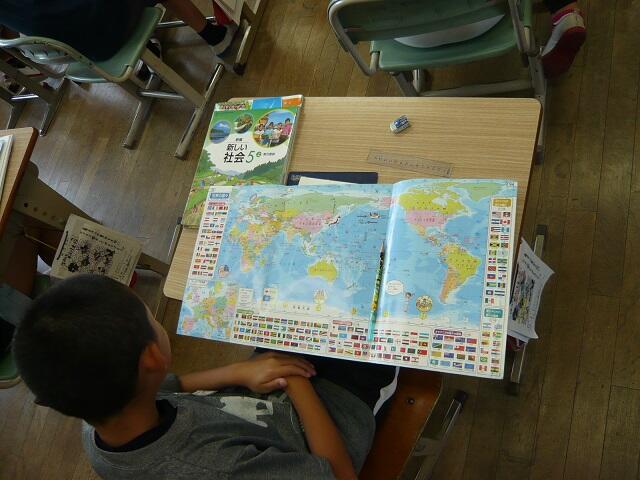 地図を見ながら、いろいろな国について学んでいる様子です。