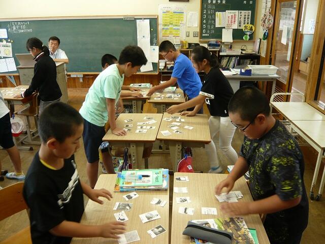歴史上の人物や建物など、歴史カルタをしながら復習しています。