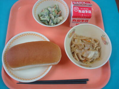 ↑ 7月18日の給食は、減量コッペパン、牛乳、焼きうどん、ちくわサラダでした。
