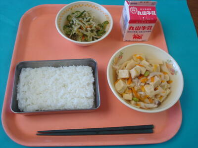 ↑ 今日の給食は、ごはん、牛乳、高野豆腐の煮物、青のり和えでした。