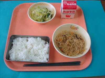 ↑ 今日の給食は、ごはん、牛乳、肉じゃが、酢みそあえでした。