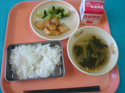 ↑ 今日の給食は、三川内小学校のリクエスト給食です。ごはん、牛乳、鶏肉のレモン和え、ゆでブロッコリー、野菜スープでした。