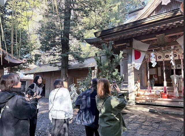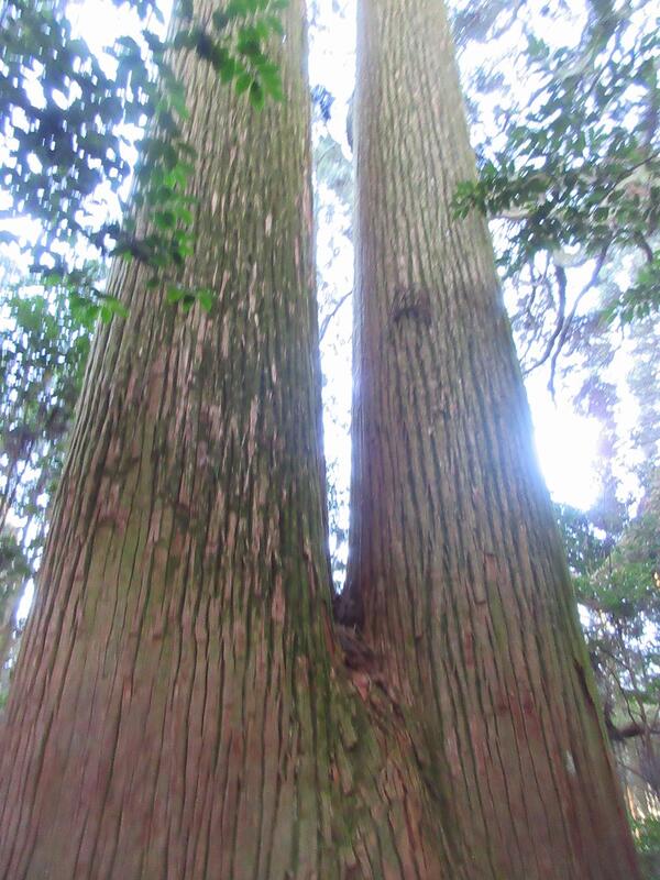 ↑「双子杉」と呼ばれる巨大な御神木がありました。木の表面は多くの方が触れているのか、つるつるとした手触りです。不思議なパワーをいただいた思いがしました。
