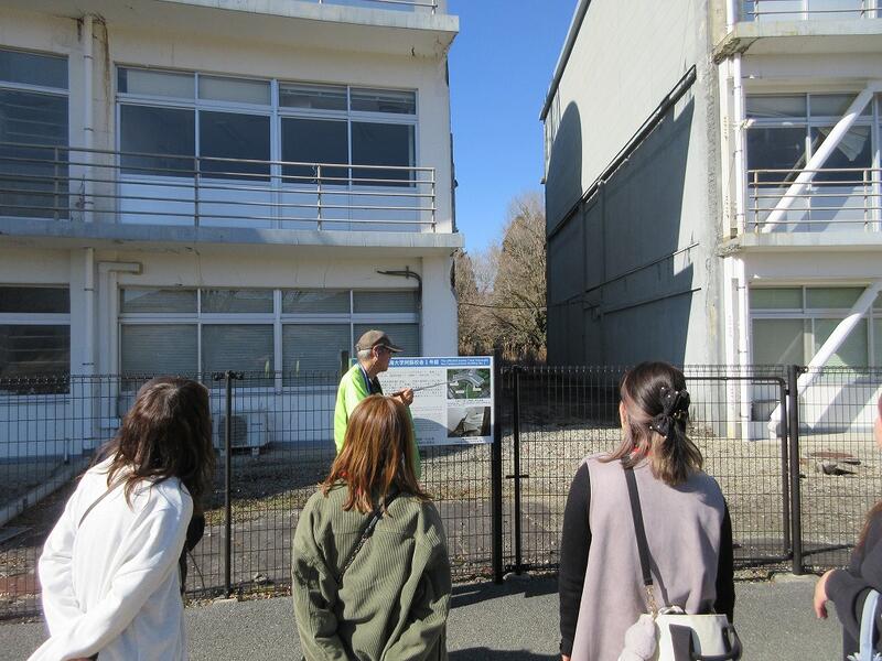↑ 校舎の左側は被害があり、右側は全く被害がありません。もともと校舎はつながっていたそうですが、地震後に断層部分の校舎を取り除いたとのことです。