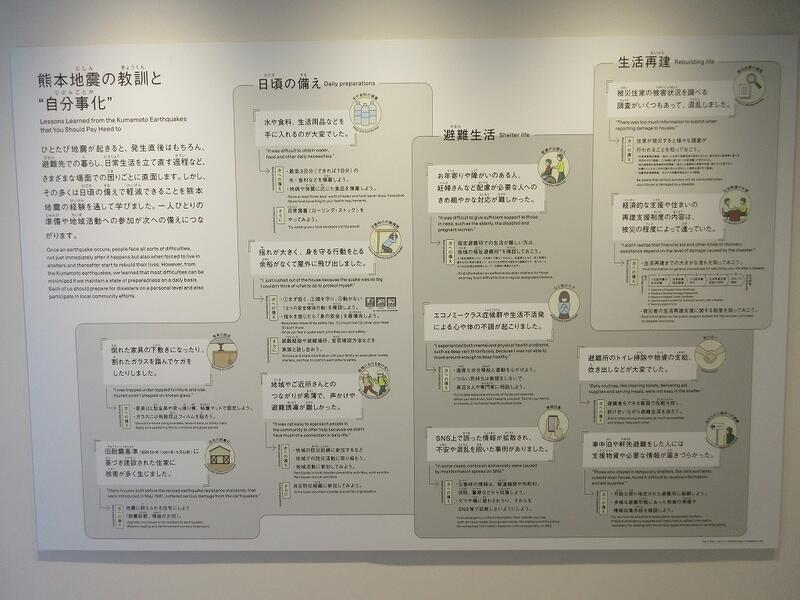↑ 見学施設の出口付近には、熊本地震での教訓が掲示されていました。日頃の備え、人と人とのつながりの大切さなどを改めて学ぶ機会となりました。