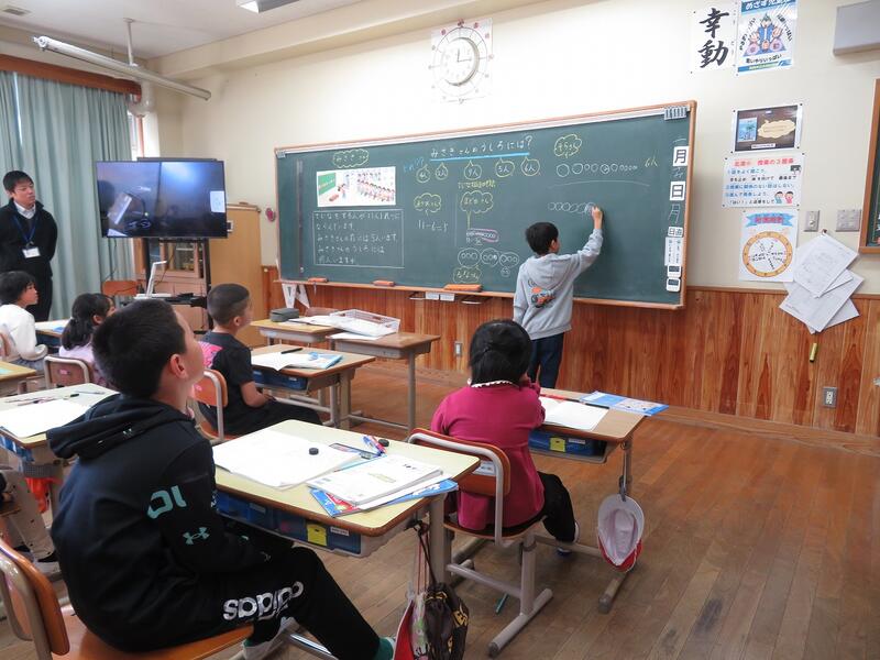 ↑2年生の学習は、「11人が1列に並んでいて、前に5人いたら後ろには何人いるか」とい内容でした。友達と考えを発表し合ったり、図や式で考えたりと、子ども達の学びがよかったです。