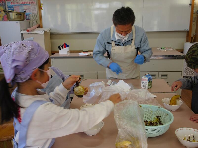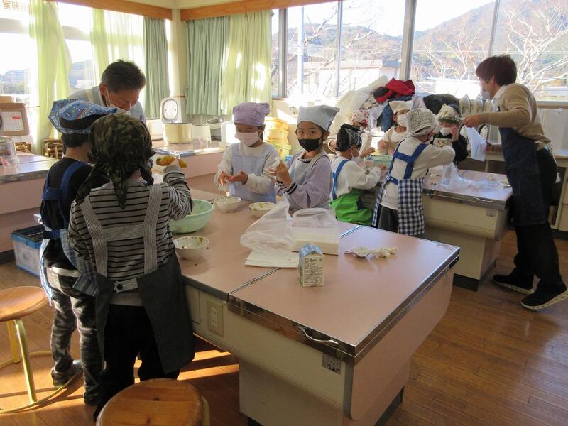 ↑ 1,2時間目の家庭科室では、1年生が生活科の学習で収穫したさつまいもを使って、スイートポテトづくりをしていました。