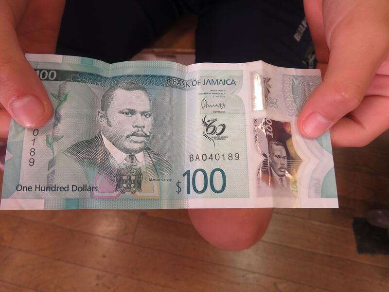 ↑ジャマイカの100ドル札だそうです。たくさんのジャマイカの文化を教えてもらえ、子ども達も喜んでいました。ウサイン・ボルトはお友達だそうです。