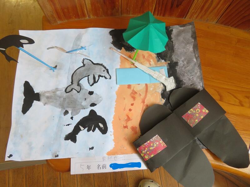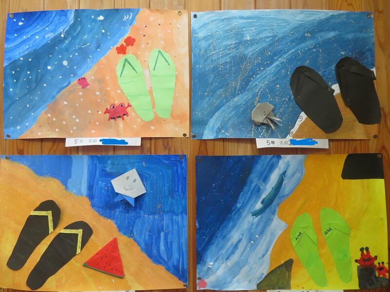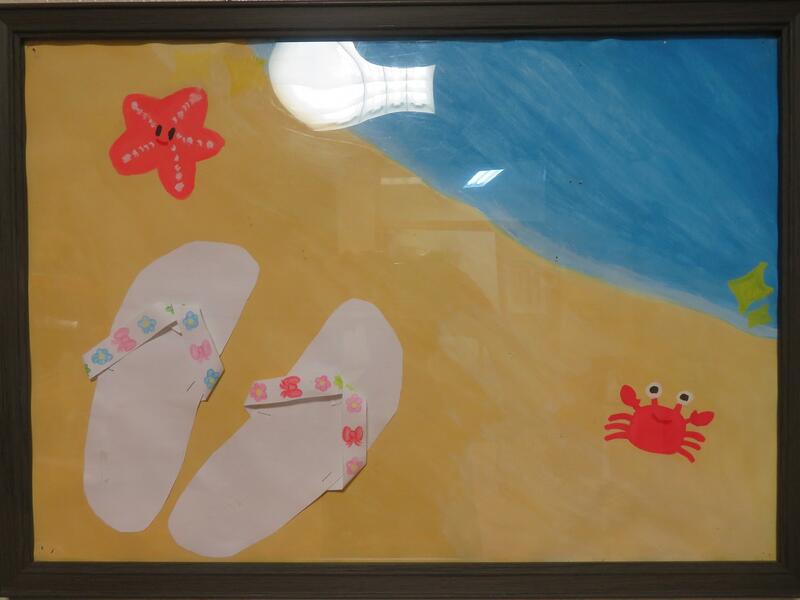 絵なんですが部分的に立体になっている「足形でビーチサンダル」という作品だそうです。みんな上手で夢ある作品に仕上がってます。