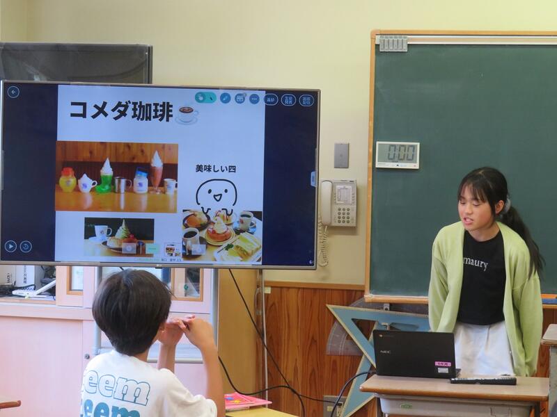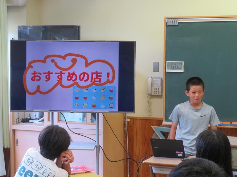 6年生が国語の学習で修学旅行でのPR活動に向けて、「おすすめのお店」をテーマに、簡単なプレゼンを作り紹介する学習をしていました。途中から見たので全員分は見ることができませんでしたが、どの子も素晴らしいプレゼンでした。