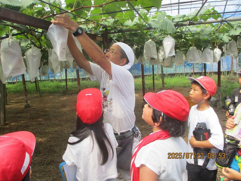 3年生はぶどう農家の方の仕事の工夫や苦労を知る学習で、校区内の「大戸果樹園」さんへ行き、ぶどう畑を見学させていただきました。