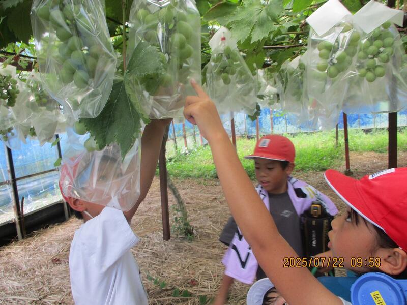 ↑3年生は校区内の果樹園にぶどうの見学に行きました。歩いて元気に出発しました。