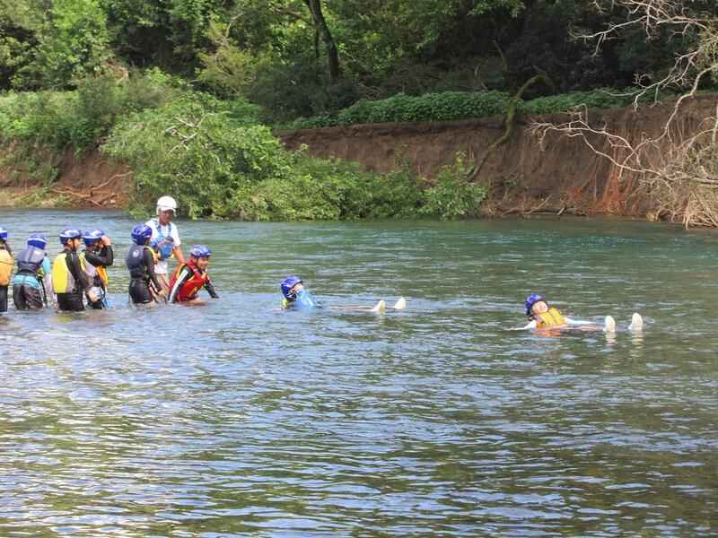 まずは、ライフジャケットを着て、水に浮くことから体験をしました。川下に足を向け、流れる方向を見ることや流れに変化があることなどを学びました。