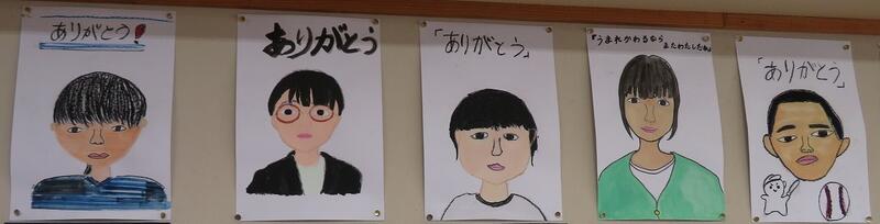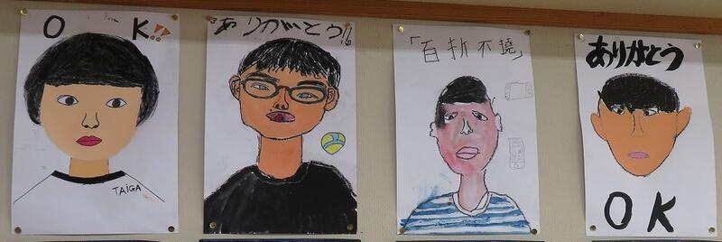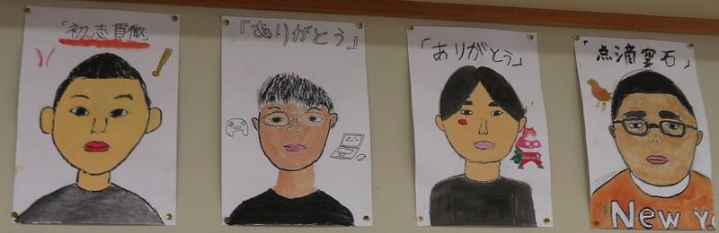 ↑一人一人の似顔絵がよく似ていて上手ですね。似顔絵の上の言葉は自分の好きな言葉だそうです。
