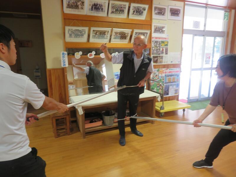 ↑職員はさすまたを使って、不審者役の興梠さんを押さえます。