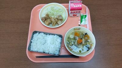 今日の献立は、ご飯、牛乳、チキン南蛮、キャベツ添え、千切り大根の味噌汁です。今日はチキン南蛮の日だそうです。78(なんばん)でしょうか。チキン南蛮は延岡発祥の料理です。洋食屋「ロンドン」で修行した2人の料理人が「ロンドン」のまかない料理をもとに考案した料理だそうです。今日のチキン南蛮もとてもおいしかったです。