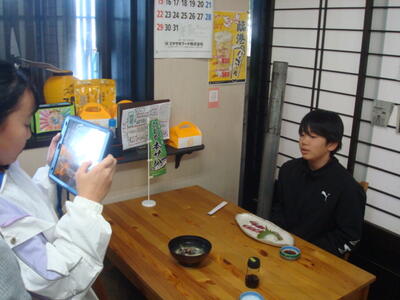 ↑ 食レポの撮影中です。「見た目柔らかそうでけど、プリプリ、コリコリしていて、おいしいです。」「油がのっていておいしいです。」などの食レポがありました。