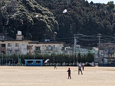 1年生が凧あげをしていました。昼間の気温も上がり、風も吹いていたので凧あげにはベストコンディション。低空飛行する凧やかなり上空を飛んでいる凧もあり、楽しい時間を過ごしていたようです。