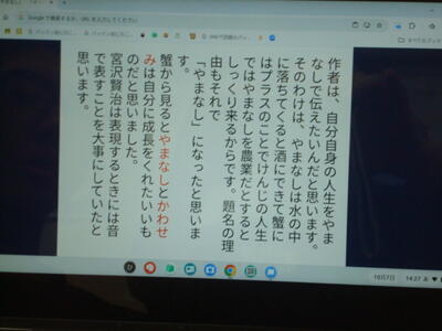 6年生は国語で、やまなし(宮沢賢治 作)というお話を読み取る学習をしています。もう最後の段階あたりですが、宮沢賢治さんは、この作品でどのようなことを伝えたかったのかを子どもたちが考え、まとめる内容でした。