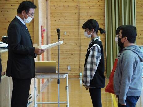 始業式では1年生のさかいしょうご君、6年生の菅野夏海さんが3学期の