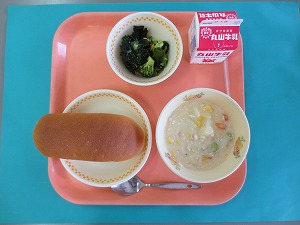 今日の給食は、コッペパン、牛乳、コーンシチュー、海藻サラダです。
