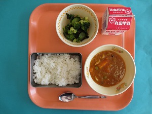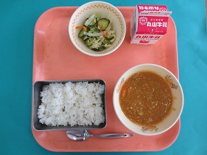 ↑ 今日の給食は、熊野江小学校のリクエスト献立でした。献立は、ご飯、昆布と大豆のカレー、キャベツのレモン和えです。