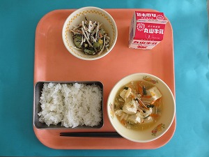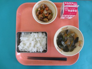 今日の給食は、ご飯、牛乳、鶏肉と厚揚げの味噌煮、磯香和えです。