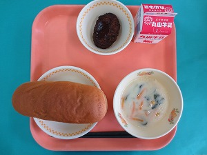 ↑ 今日の給食は、こくとうパン、牛乳、豚肉のゴマみそ和え、白花豆のスープです。