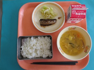 ↑ 今日の給食は、ごはん、牛乳、あじの変わりあげ、八杯汁です。