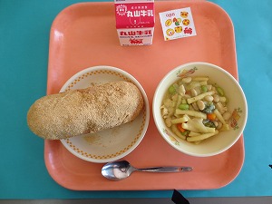 ↑ 今日の給食は、ミルメークあげパン、牛乳、マカロニのトマトソース煮、型抜きチーズでした。