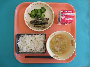 今日の献立は、ご飯、牛乳、いわしの梅煮、きゅうりの塩もみ、ごじるです。