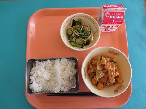 今日の献立は、ご飯、牛乳、マーボー春雨、ナムルです。