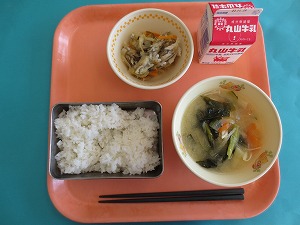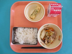 ↑ 今日の給食は、ごはん、牛乳、サツマイモ煮物、青のりあえです。