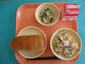 ↑ 今日の給食は、減量コッペパン、牛乳、肉うどん、ごぼうサラダです。