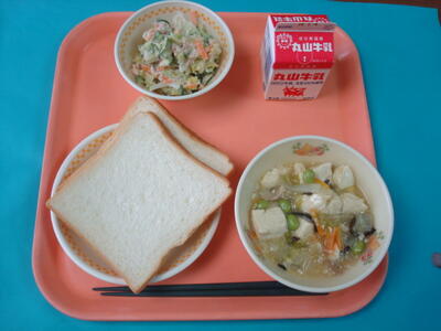 ↑ 今日の給食は、ツナサンド、牛乳、豆腐の中華煮です。