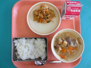 今日の給食は、ご飯、牛乳、鶏肉と厚揚げの味噌煮、磯香和えです。