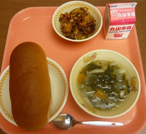 3月22日 たこ焼き風 中華スープ いもっ粉パン 牛乳