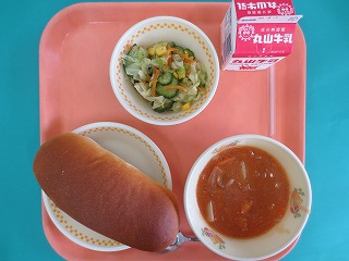 今日の献立は、バーガーパン、牛乳、てりやチキンパティ、ゆでキャベツ、ミネストローネです。