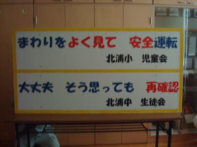 交通安全啓発のメッセージは北浦小・中学校の生徒会・児童会から出てきたものを採用しました。下の写真が啓発ボードの作成状況です。