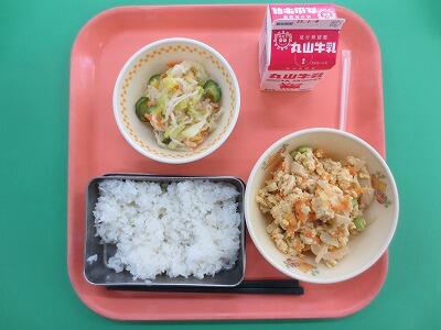 今日の献立は、ご飯、牛乳、炒り豆腐、千切り大根のピリ辛和えです。